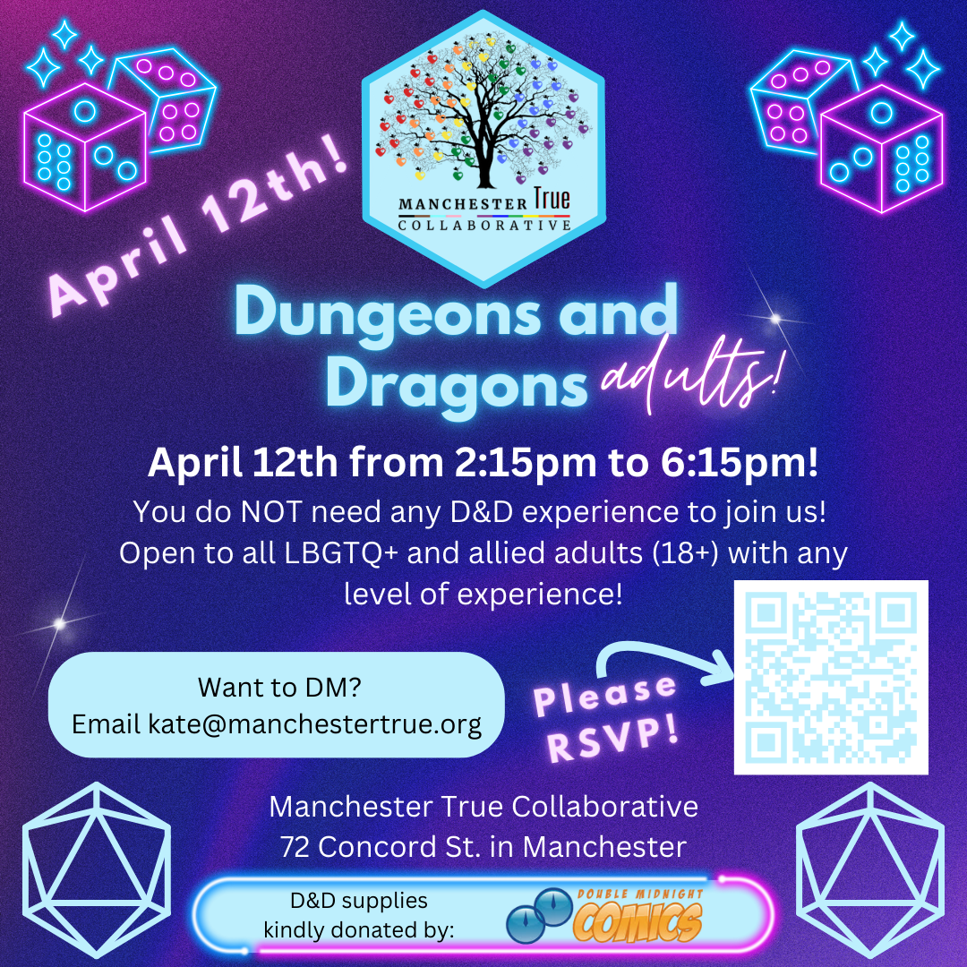 Join us April 12th from 2:15pm to 6:15pm for 18+ D&D! If you’d like pizza, please bring cash to contribute!