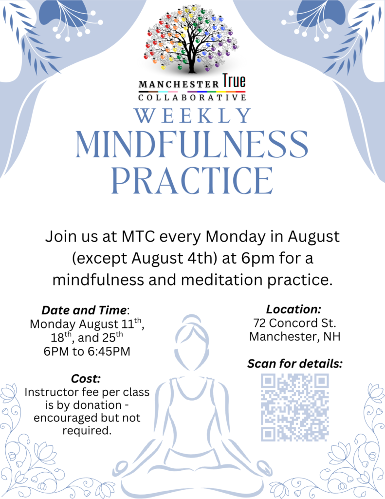 Description: Join us at the Manchester True Collaborative Community Center every Monday in August (except August 4th) at 6pm for a mindfulness practice.