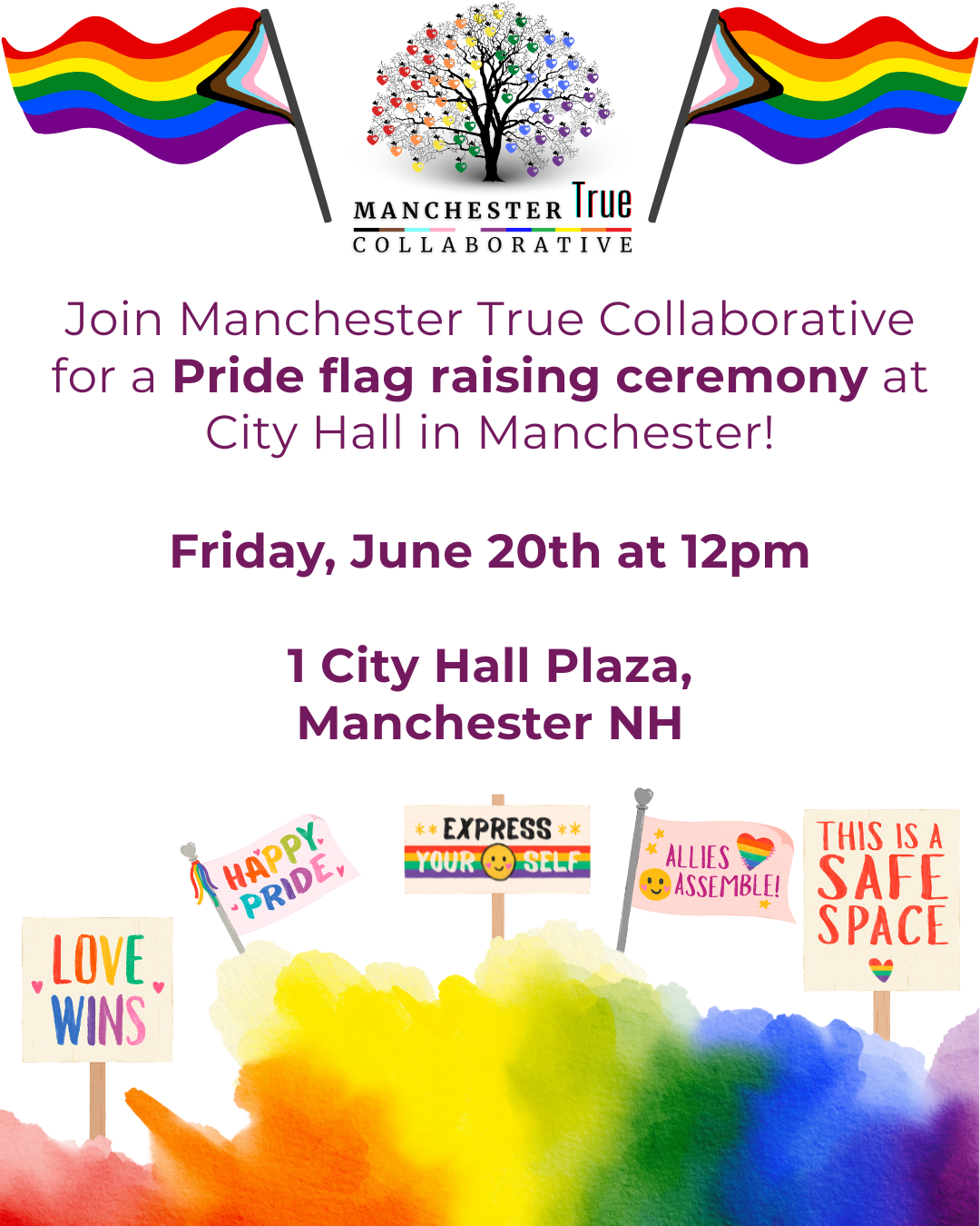 Join us at noon on Friday, June 20th at Manchester City Hall as we raise the pride flag to celebrate pride month in Manchester!