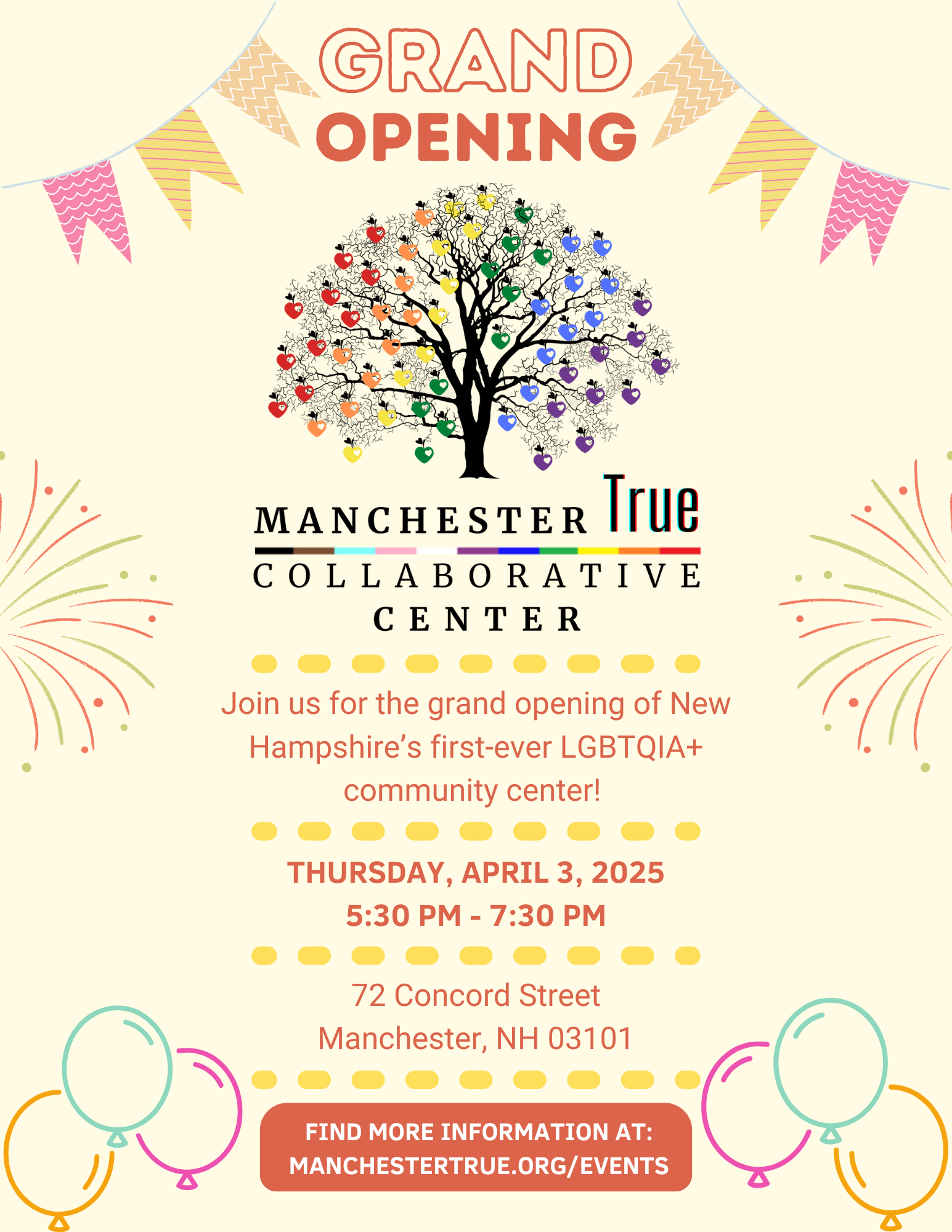 Join us for the grand opening of New Hampshire’s first-ever LGBTQIA+ community center! Celebrate inclusivity, support, and unity with a brief introduction & center tour, programming updates, community conversation, and more! Be a part of this historic moment as we create a safe and vibrant space for everyone. Don’t miss out on this milestone event – we can’t wait to celebrate with you!