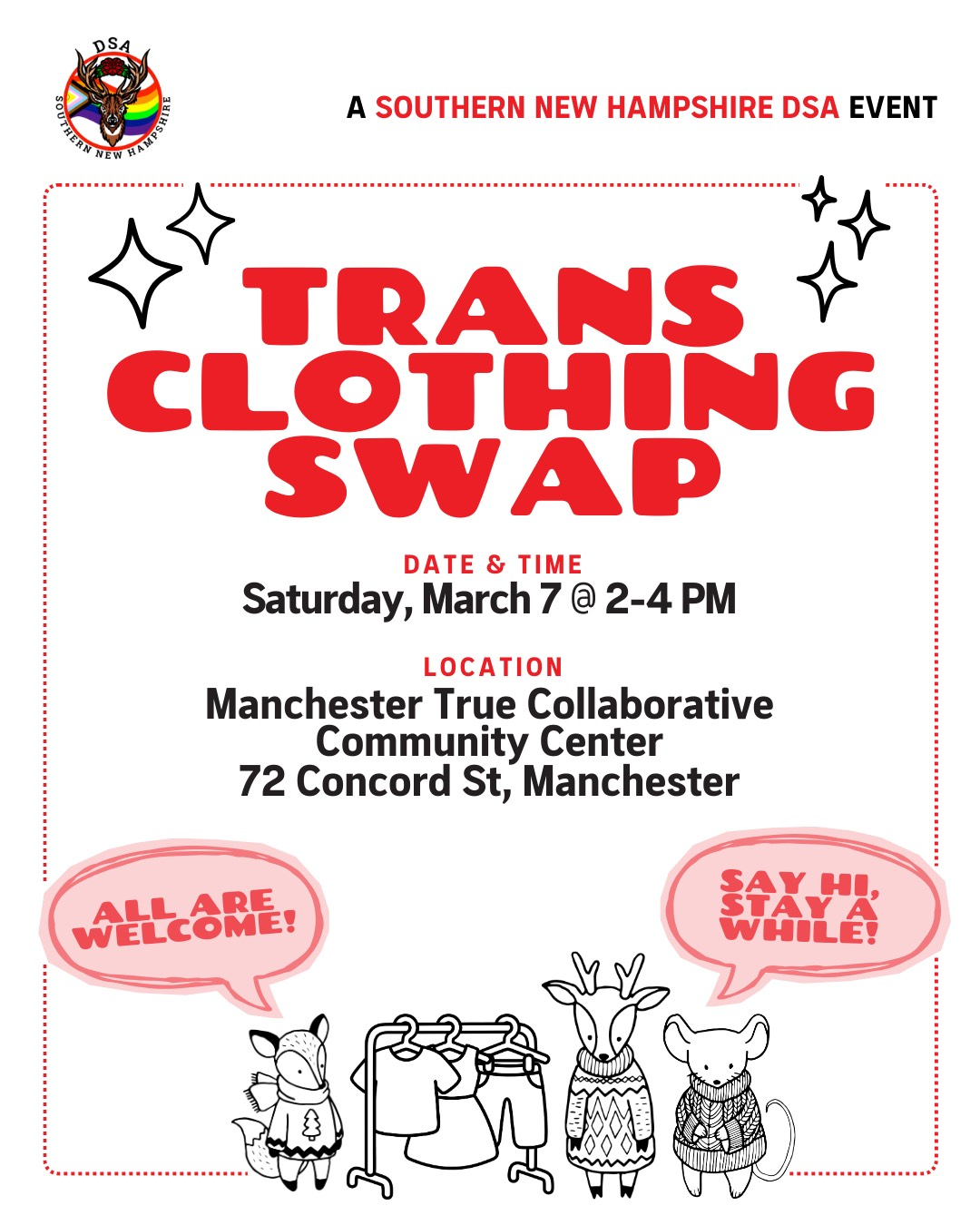 We are excited to be hosting a trans clothing swap at the Manchester True Collaborative Community Center in partnership with Southern New Hampshire DSA.
