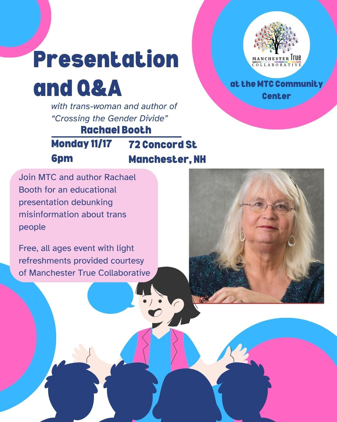 Join us at Manchester True Collaborative on Monday, November 17th at 6pm for a ted-talk style presentation by community member Rachael Booth as she shares her experiences as a trans woman. This presentation will help dispel a lot of the misinformation in our country today about trans people of all ages.