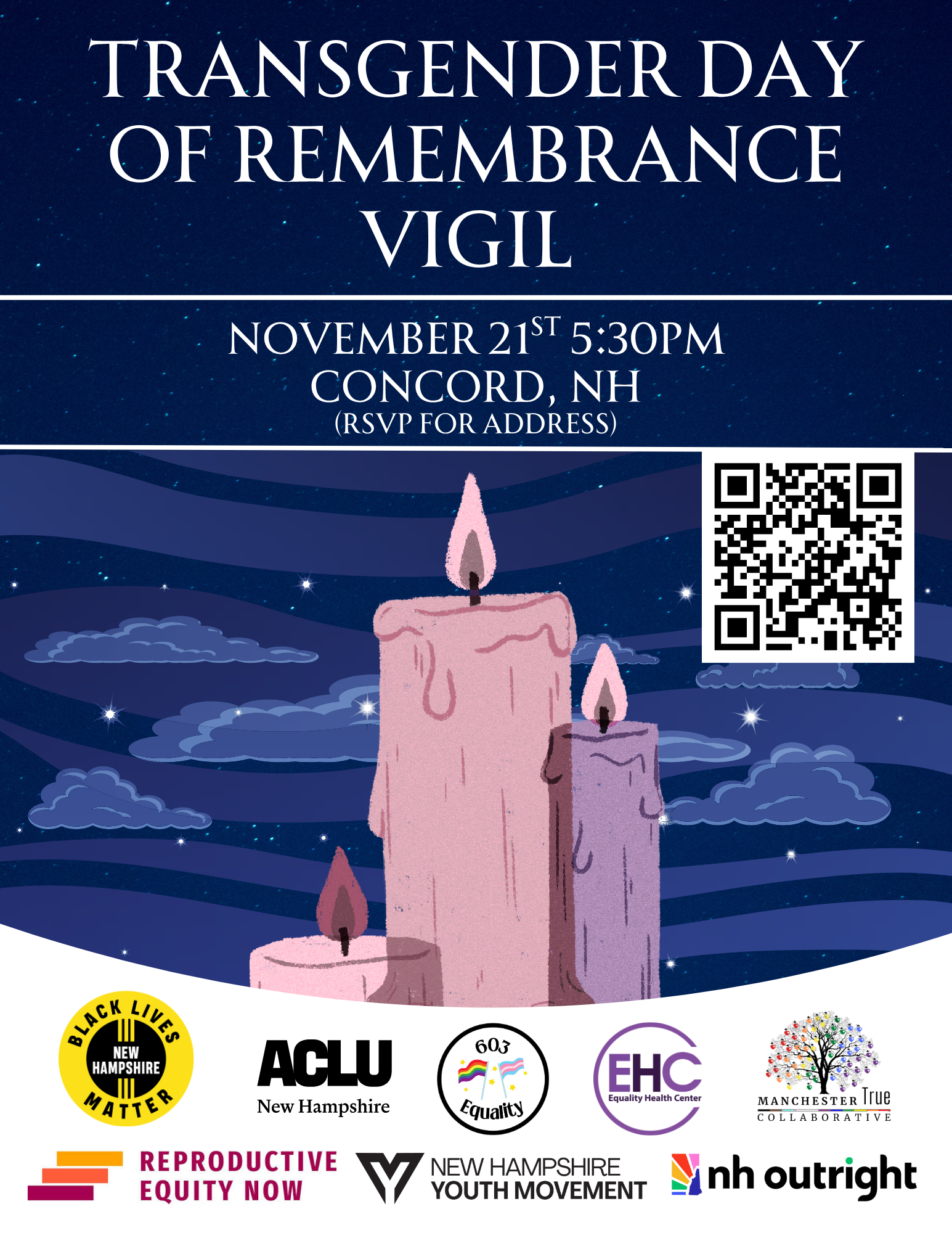 Join us on November 21st at 5:30PM in Concord to honor the memory of transgender people who have lost their lives to anti-transgender violence. We’ll gather in community, speak the names of those we’ve lost, and hear from those fighting for trans justice in New Hampshire. There will be space for community members to share the names of those missing from the public lists of those we’ve lost.