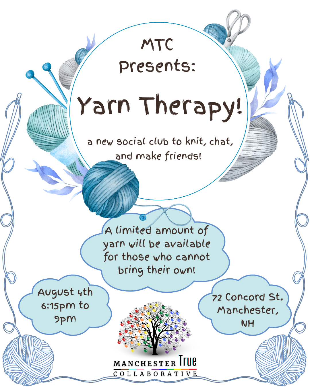 Join us during open community hours at MTC on August 4th from 6:15pm to 9pm for yarn therapy!